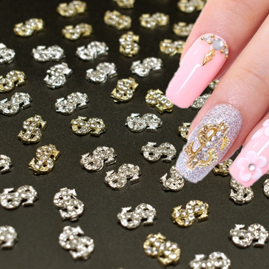 Dale un toque de lujo y estilo a tus uñas con estos dijes metálicos en forma de dólar, decorados con strass brillantes. ✨