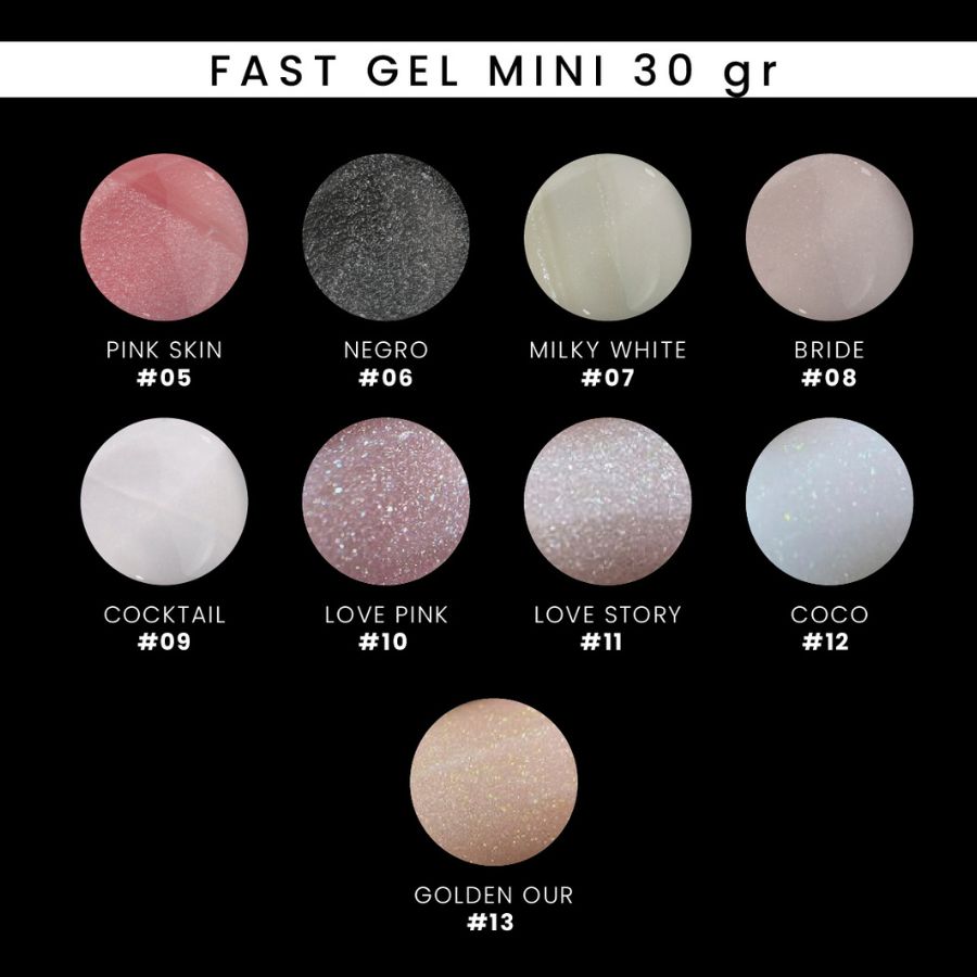| Fast gel de 30 grs | Blanco, Bride, Cocktail, Coco, Golden our, Love Pink, Love story, Milky white, Negro, Pink skin |