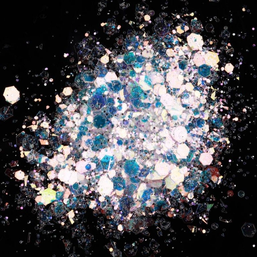 Disponible en varios colores — blanco, rosa, azul, amarillo y lila — este glitter aporta un efecto luminoso, llamativo y lleno de energía.